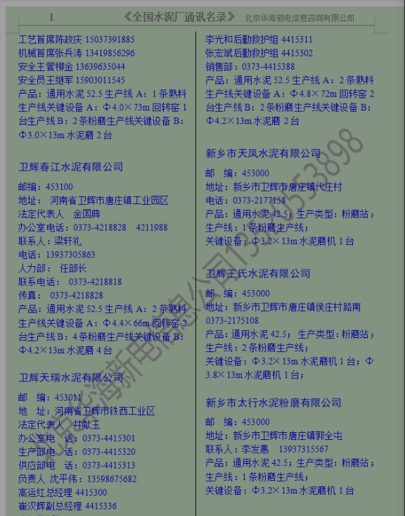 《全國水泥廠通訊名錄》由北京華海新電科技有限公司在2002年 開始發(fā)行,到今年已經(jīng)走過了17個年頭,期間得到廣大新老客戶的支持幫助,在此一并致謝!《全國水泥廠通訊名錄》一直在更新,每年都會編輯進去新投產(chǎn)的水泥廠,停產(chǎn)的機組,產(chǎn)能出讓的廠家也會標注出來。水泥廠屬于產(chǎn)能過剩的行業(yè),這幾年一直在兼并重組,產(chǎn)能轉(zhuǎn)讓,關(guān)停并轉(zhuǎn),企業(yè)名稱一直在變,本資料只提供企業(yè)當前的名稱。本書內(nèi)容包括:全國31個省市地區(qū)的水泥企業(yè)3800多家。大、中、小型水泥生產(chǎn)企業(yè)(水泥廠、熟料廠、粉磨站)的地址、郵編、投產(chǎn)時間,產(chǎn)品,主機設備,重要科室負責人的姓名、聯(lián)系電話及部分。是企業(yè)聯(lián)系客戶的重要資料。