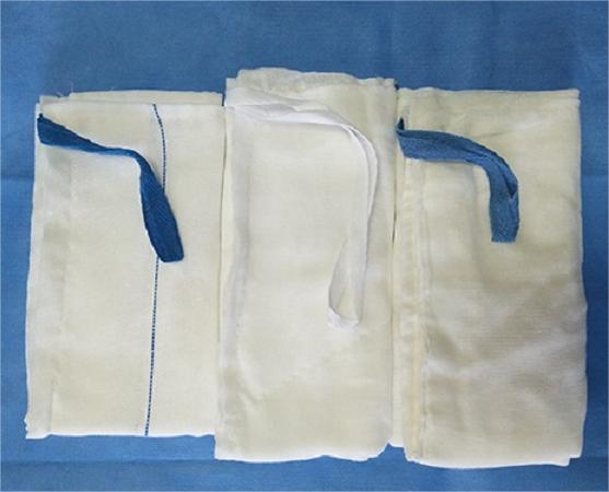 結(jié)構(gòu)及組成:I型:由脫脂紗布加工制成;II型由夾有X射線可探測組件的脫脂紗布?jí)K加工制成,腳步均可縫制一根腹巾帶。